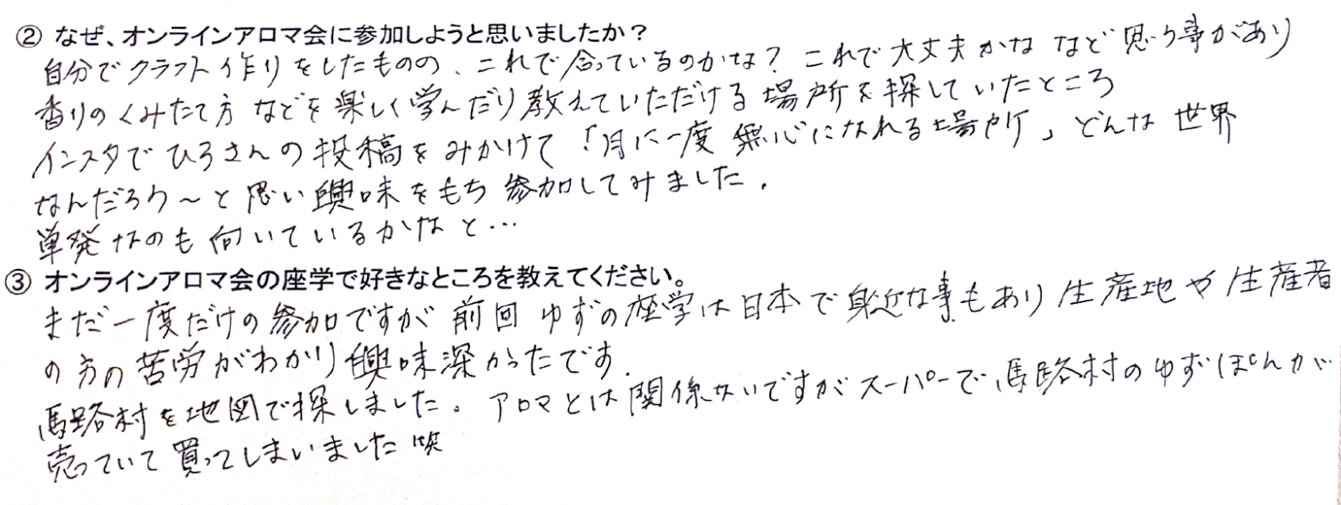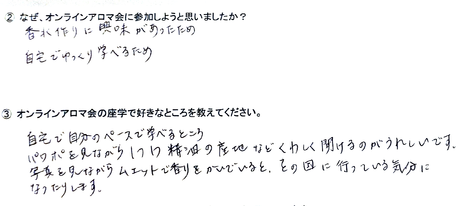 Q.オンラインアロマ会の座学で好きなところを教えてください。